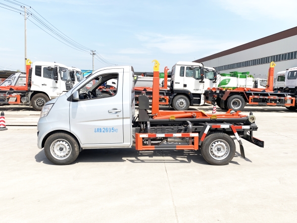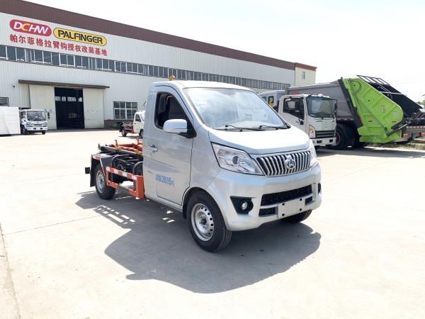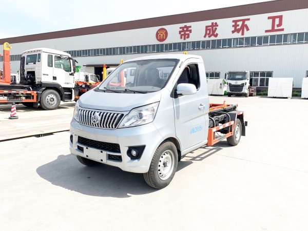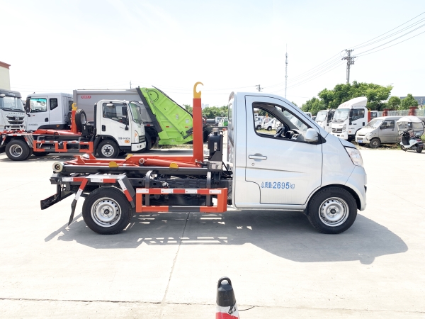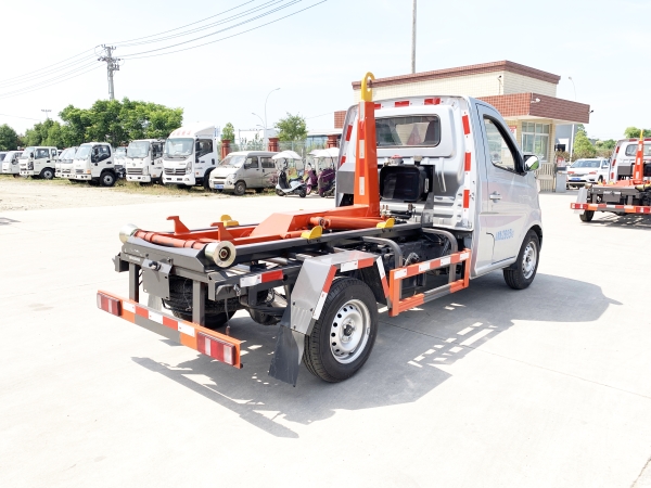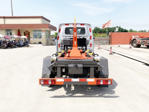 車廂可卸載式垃圾車,又稱勾臂式垃圾車、拉臂式垃圾車。該車廣泛適用與城市街道學校垃圾處理,可一車配備多個斗,各個垃圾點放置多個,帶自卸功能,液壓操作,方便傾倒。在平日里可將車載垃圾箱放置到各個垃圾收集站,待垃圾收集滿后,該車可直接開赴至垃圾站,通過液壓系統的操控,可將垃圾車后座上加裝的勾臂放下,掛住站內垃圾箱前端的連接點,將垃圾箱拉至車體的后座上,此時即可啟動車輛,將垃圾運送至垃圾處理站內,進行自卸式傾倒。該車主要的優點就是可一車配多斗,一輛車就可以維持數個垃圾收集站的運轉,效率高,且箱體為密封式設計,不會造成二次污染。