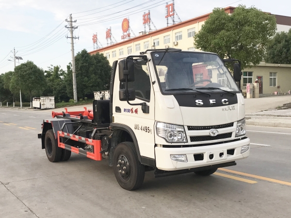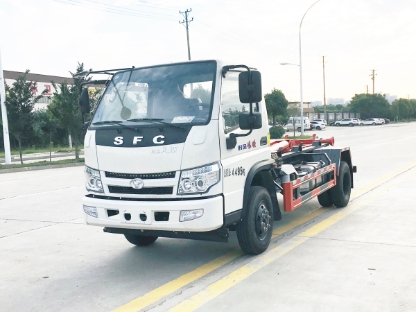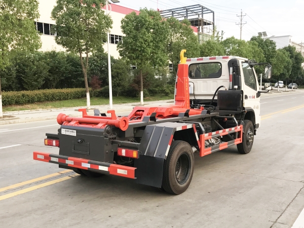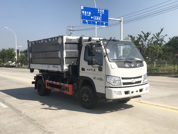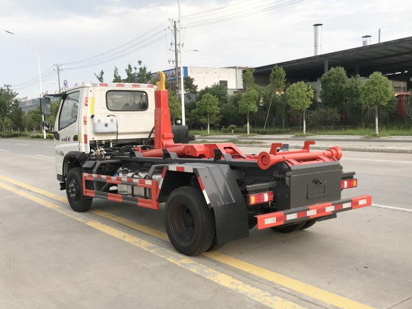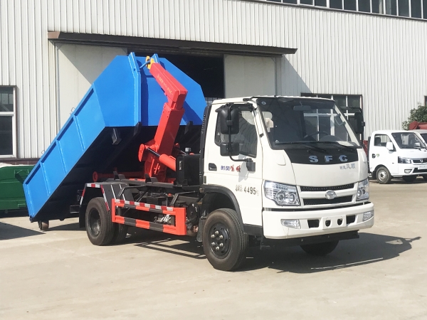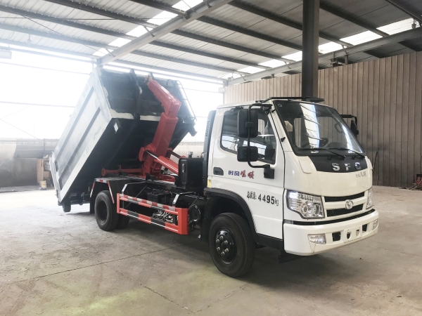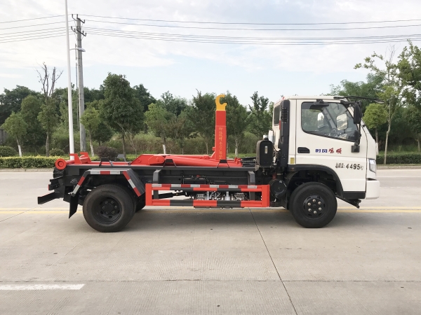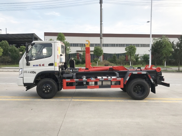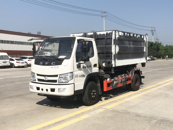 車廂可卸載式垃圾車,又稱勾臂式垃圾車、拉臂式垃圾車。該車廣泛適用與城市街道學校垃圾處理,可一車配備多個斗,各個垃圾點放置多個,帶自卸功能,液壓操作,方便傾倒。在平日里可將車載垃圾箱放置到各個垃圾收集站,待垃圾收集滿后,該車可直接開赴至垃圾站,通過液壓系統的操控,可將垃圾車后座上加裝的勾臂放下,掛住站內垃圾箱前端的連接點,將垃圾箱拉至車體的后座上,此時即可啟動車輛,將垃圾運送至垃圾處理站內,進行自卸式傾倒。該車主要的優點就是可一車配多斗,一輛車就可以維持數個垃圾收集站的運轉,效率高,且箱體為密封式設計,不會造成二次污染。